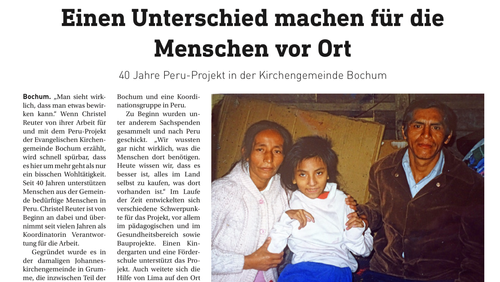 Einen Unterschied machen für die Menschen vor Ort: Die evangelische Zeitung “Unsere Kirche“ hat über unser Perú-Projekt berichtet. Den gesamten Artikel können Sie hier lesen.